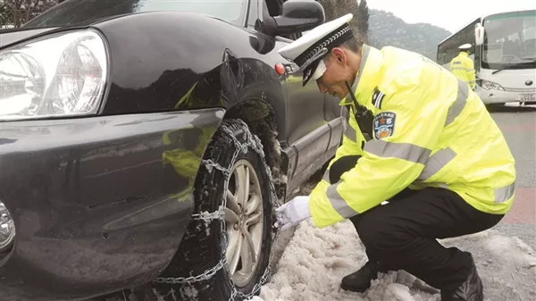 △王麗偉正在為過往車輛檢查防滑鏈。(圖/三峽日報)
