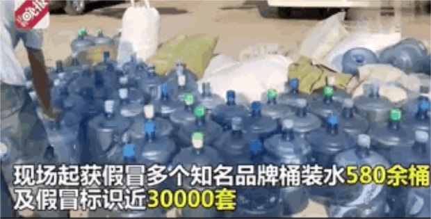 6月21日凌晨,北京市執(zhí)法部門對這一制造銷售假冒桶裝水窩點,及位于朝陽區(qū)、西城區(qū)、豐臺區(qū)的4個下線水站實施統(tǒng)一收網抓捕,抓獲制售假冒桶裝水嫌疑人3名,下線銷售水站涉案人員3名,查獲假冒多個知名品牌的桶裝水580余桶、假冒標識近30000套,涉案金額80余萬元。