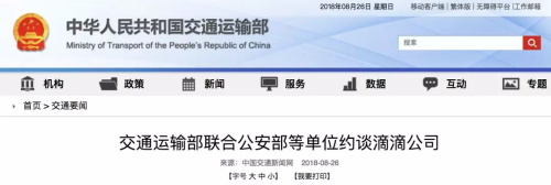 8月26日下午,交通運(yùn)輸部聯(lián)合公安部以及北京市、天津市交通運(yùn)輸、公安部門,針對(duì)上述事件,對(duì)滴滴公司開展聯(lián)合約談。