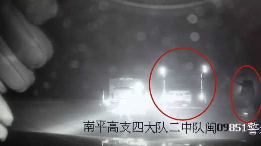 途經(jīng)福銀高速邵武上村大橋路段時,他們發(fā)現(xiàn)一輛運輸商品車的重型半掛牽引車因故障無法移動,占用大部分車道,同時車尾一名男子拿著開了閃光燈的手機不停揮舞,車頭還有一名女子也做著同樣的動作。