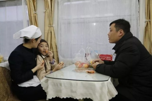 2月14日,蘆楊帶著女兒到K91次列車餐車看望妻子李楠。新華社發(fā)
