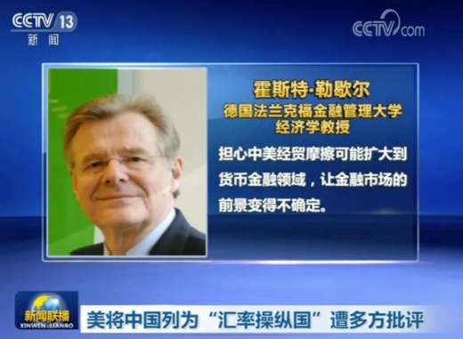 德國(guó)法蘭克福金融管理大學(xué)經(jīng)濟(jì)學(xué)教授霍斯特·勒歇爾表示,近幾年人民幣匯率承受的壓力來(lái)自市場(chǎng),中國(guó)央行沒(méi)有故意壓低人民幣匯率,美方將中國(guó)列為“匯率操縱國(guó)”是出于政治目的。勒歇爾說(shuō),投資者擔(dān)心中美經(jīng)貿(mào)摩擦可能擴(kuò)大到貨幣金融領(lǐng)域,讓金融市場(chǎng)的前景變得不確定。