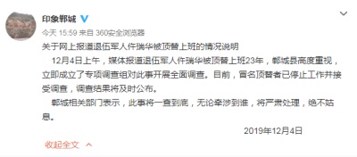 12月2日,河南鄲城縣退役軍人事務(wù)局相關(guān)負(fù)責(zé)人回復(fù)稱:當(dāng)年只安排了一個(gè)叫仵瑞華的人到宜路鎮(zhèn)政府上班,頂替一事正在調(diào)查中。