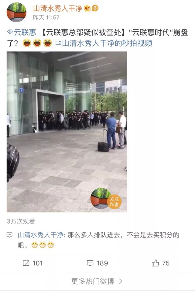 2018年5月8日7時,網(wǎng)絡(luò)傳言云聯(lián)惠官網(wǎng)及app無法打開,下午發(fā)布申明是系統(tǒng)維護(hù),當(dāng)日萬23時55分許,警方發(fā)布云聯(lián)惠被查的信息。事實(shí)上,早在當(dāng)天上午,就有多人拍攝到云聯(lián)惠廣州總部被大批警務(wù)人員包圍的視頻,并上傳到社交媒體,同時,云聯(lián)網(wǎng)官網(wǎng)及APP均無法登陸。