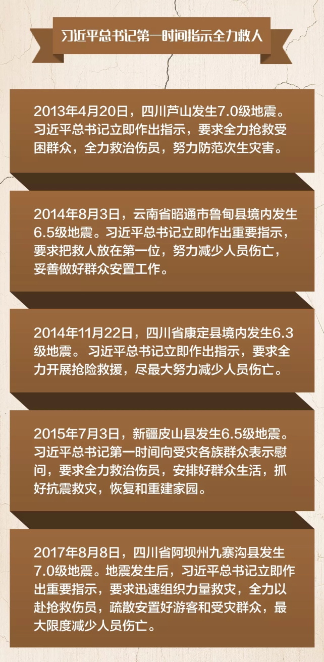 救災方面,每一次自然災害發(fā)生后,習近平總書記***關(guān)心的就是人民的安危。救人,始終是他強調(diào)的******要務。