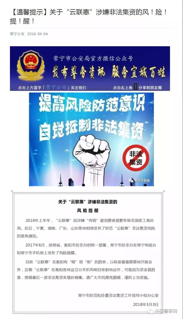 4月6日,湖北“常寧公安”的風險提示中更是道出玄機,目前“云聯(lián)惠”在湖南衡陽由“暗”轉(zhuǎn)“明”的趨勢,以前是偷偷摸摸地開展業(yè)務(wù),近期“云聯(lián)惠”在衡陽市各地設(shè)立分支機構(gòu)明目張膽地運作,極有可能因為資金鏈趨緊,想搞***后一波非法集資來填補窟窿。