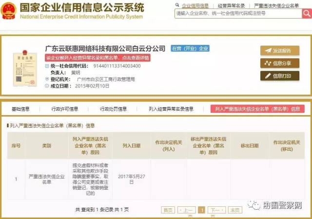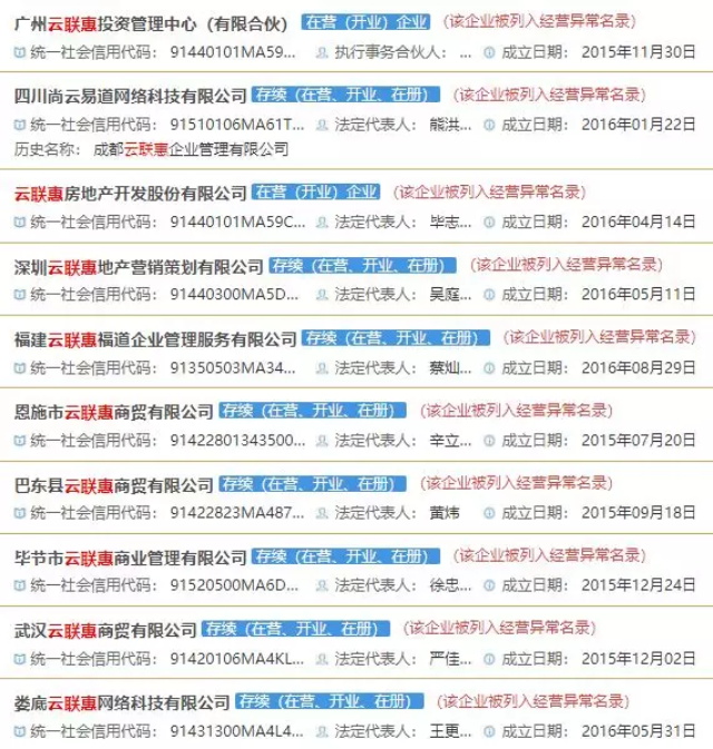 “******企業(yè)信用信息公示系統(tǒng)”中顯示,已有68家云聯(lián)惠子公司處于“經(jīng)營異常名錄”中,而其中一家公司,除了“經(jīng)營異常名錄”外,還有“嚴重違法失信企業(yè)名單”,原因不言而喻,提交虛假材料或者采取其他欺詐手段隱瞞重要事實,取得公司變更或者注銷登記,被撤銷登記的。