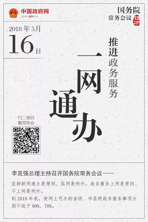 當(dāng)天會議決定,到2019年底,使網(wǎng)上可辦的省級、市縣級政務(wù)服務(wù)事項分別不低于90%、70%。