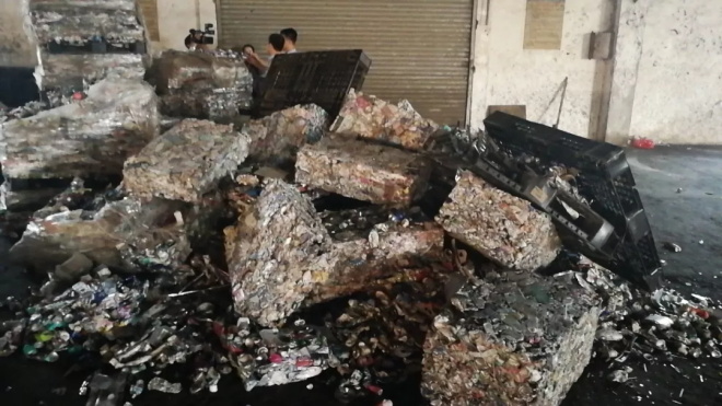 記者跟隨海關(guān)緝私人員在廣東清遠(yuǎn)市郊的一個(gè)倉庫內(nèi)發(fā)現(xiàn),印有一些印有日文、韓文、英文、泰文標(biāo)識(shí)的廢舊鋁罐、銅線、五金廢料種 類繁多,有的散發(fā)出一股刺鼻的味道,表面殘留著粘稠狀不明液體。