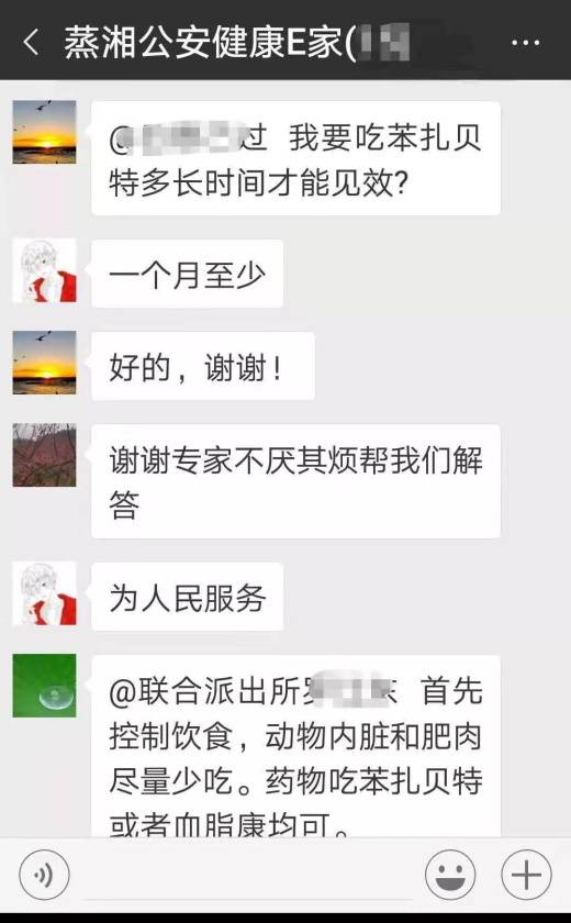 在做優(yōu)硬件的同時(shí),蒸湘分局還建立了“蒸湘公安健康E家”微信群,并邀請衡陽市中心醫(yī)院副院長、心血管專家劉小平教授,南華附一醫(yī)院心血管內(nèi)科主任劉廠輝教授和韶關(guān)市人民醫(yī)院糖尿病科主任鄧國寶教授入群指導(dǎo),向民警提供科學(xué)建議、用藥咨詢和線下會診,為民警尋醫(yī)問診提供了極大的方便。