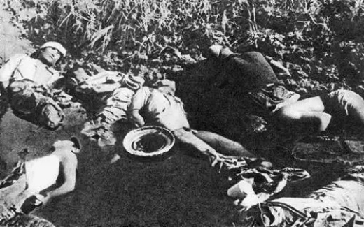 △日軍將失去戰(zhàn)斗力之中國軍人反綁雙臂、集體殺戮后擲入水池中。池水被鮮血染紅,此池中遺體達300余具。