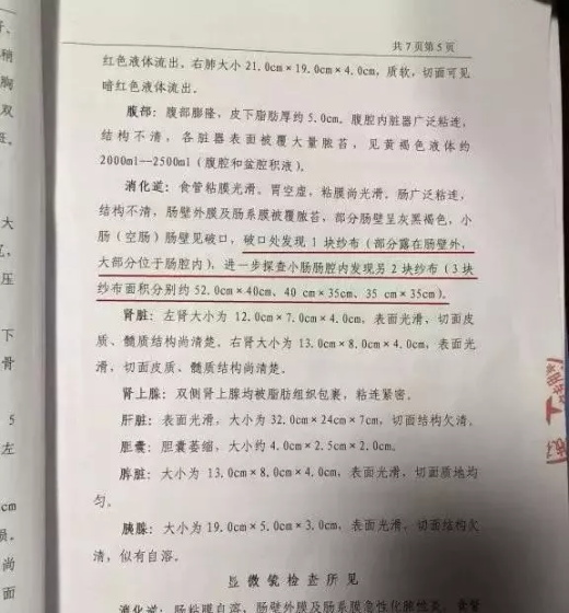 在死者袁平秀腸道內(nèi)的三塊紗布,是她2018年6月6日在攀枝花宏實醫(yī)院做“剖宮取胎術(shù)”時遺留的,就是這三塊紗布,***終引發(fā)患者感染性休克、導(dǎo)致死亡。經(jīng)過四川省和攀枝花市相關(guān)專家分析和鑒定,這一事故被定性為一級甲等醫(yī)療事故,攀枝花宏實醫(yī)院承擔主要責任。