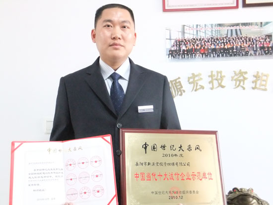 岳陽(yáng)市新源宏投資擔(dān)保有限公司榮獲中國(guó)當(dāng)代十大誠(chéng)信企業(yè)示范單位,董事長(zhǎng)晏源宏同志當(dāng)選為中國(guó)當(dāng)代十大誠(chéng)信企業(yè)家.