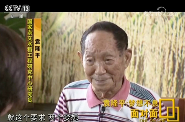袁隆平:對(duì)自己沒有要求,就是這個(gè)要求:一個(gè)是“禾下乘涼夢(mèng)”,一個(gè)“覆蓋全球夢(mèng)”,雜交稻。就這個(gè)要求,兩個(gè)夢(mèng)想。