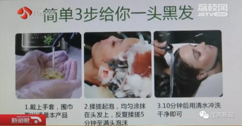 按照使用說明,記者戴上手套將產(chǎn)品涂抹于假發(fā)套上,20分鐘后用清水洗凈,本來是花白頭發(fā)的假發(fā)套果然瞬間變黑了。