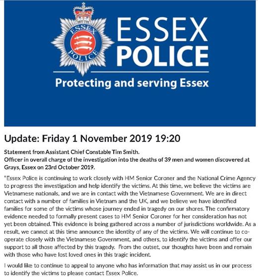 警方稱,他們正與越南政府進行聯(lián)絡(luò),并同多個越南和英國的家庭進行了直接接觸,相信他們已經(jīng)辨別出一些遇難人員的身份。確認(rèn)身份的證據(jù)還需要正式提交給英國驗尸官辦公室;因此,目前警方還不能公布任何遇難者的身份。