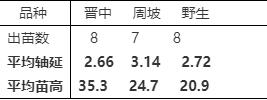 從苗子大小看,因為晉中是主要栽培種,籽粒大,苗子長得高,而且一出土的葉子就比較寬,與周坡及野生顯著不同。野生與周坡苗高沒有顯著差別。而軸延體長度晉中***短。育苗箱的中間是晉中,兩邊是野生和周坡。