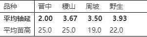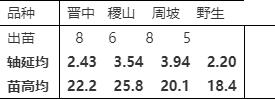 從表中可以看出:晉中高粱的軸延體明顯比其它都短,其它都﹥3,而它﹤3。現(xiàn)在用它跟其它3種比較,所占百分比分別為:是稷山的68.5%;周坡的68.8%;野生的77.6%。苗高則為晉中﹥野生﹥周坡﹥稷山。